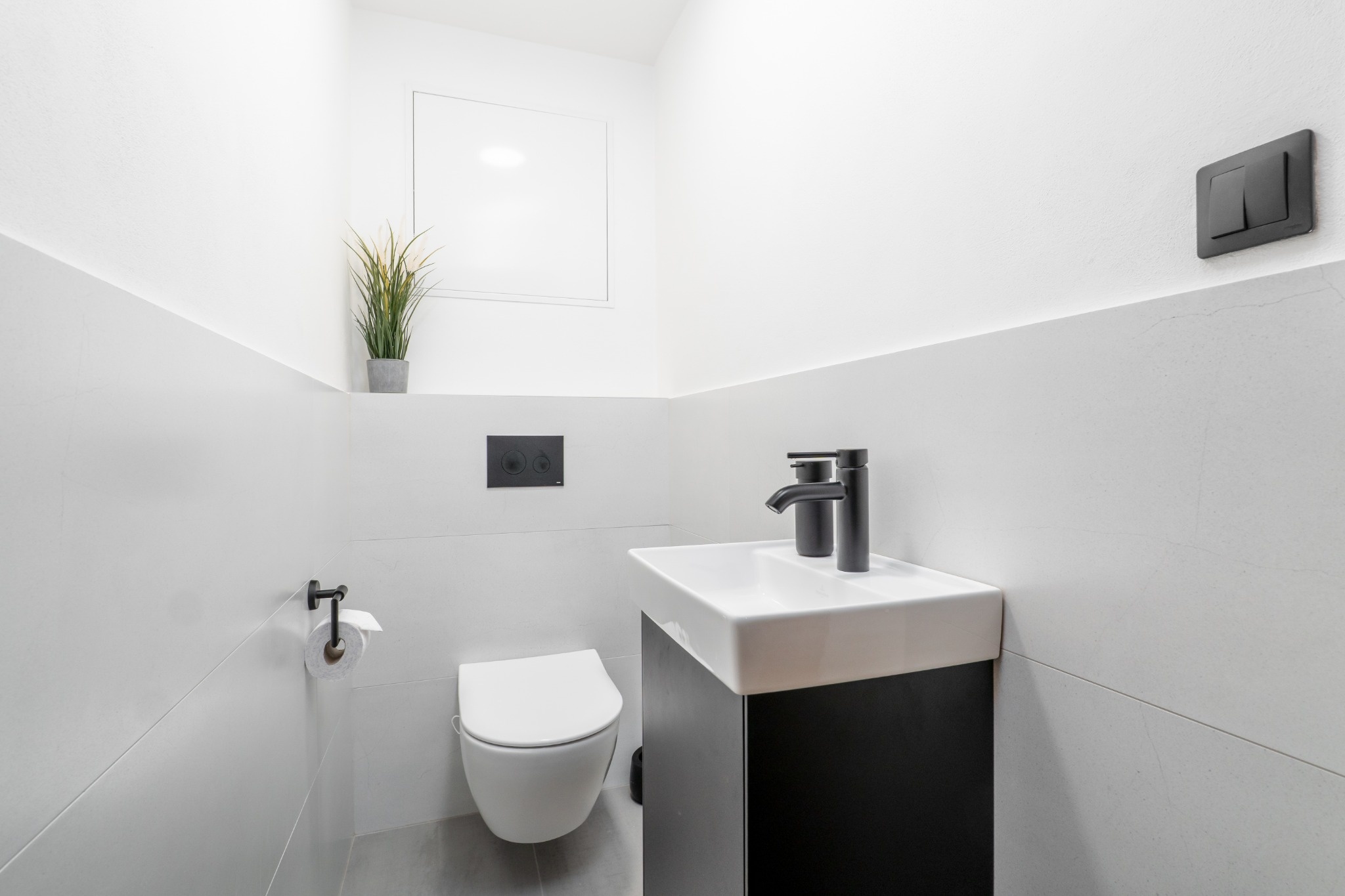 Koupelna v prémiovém standardu: sanita Villeroy & Boch, sprchový kout HÜPPE, podomítkové WC TECE