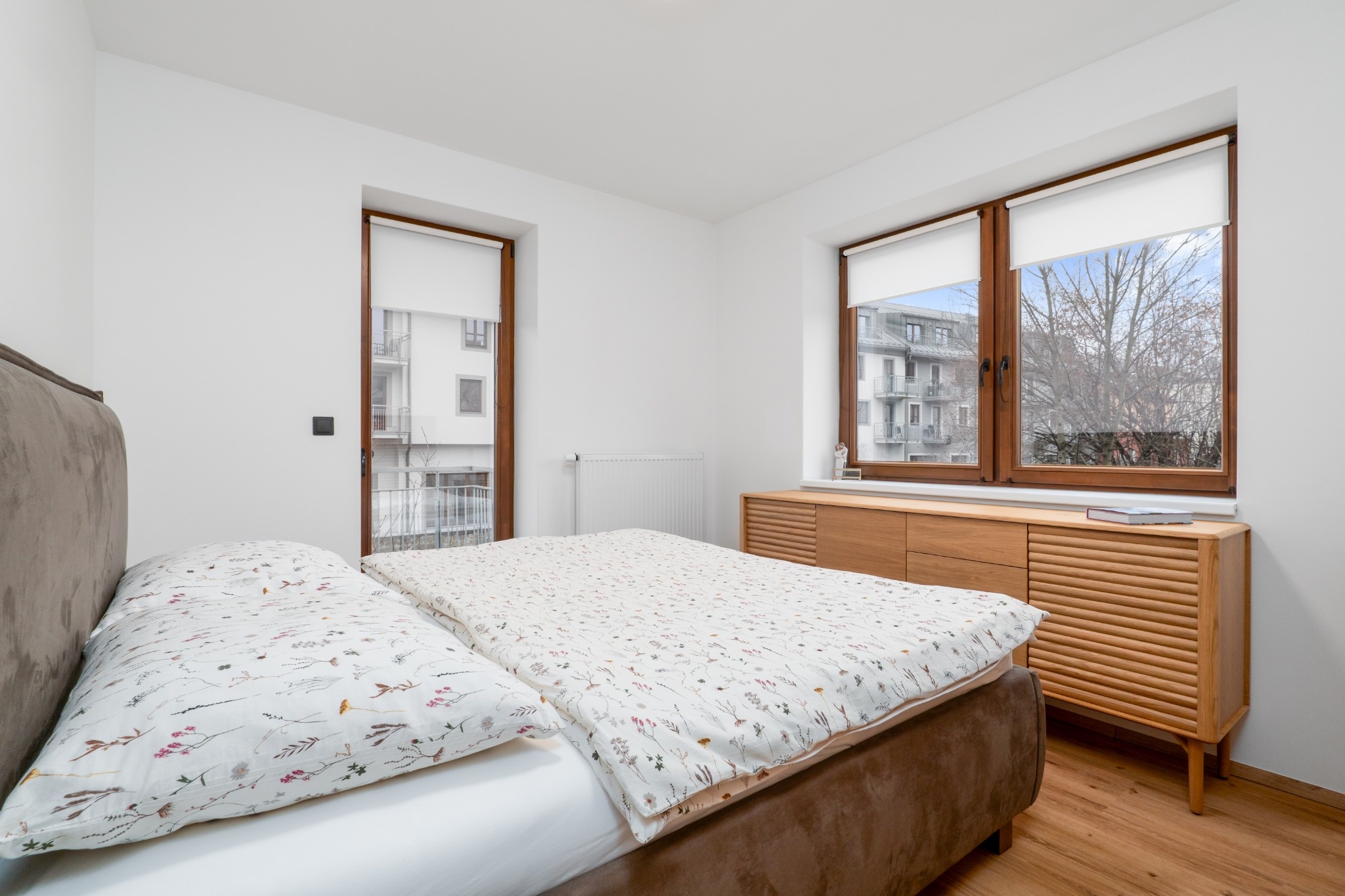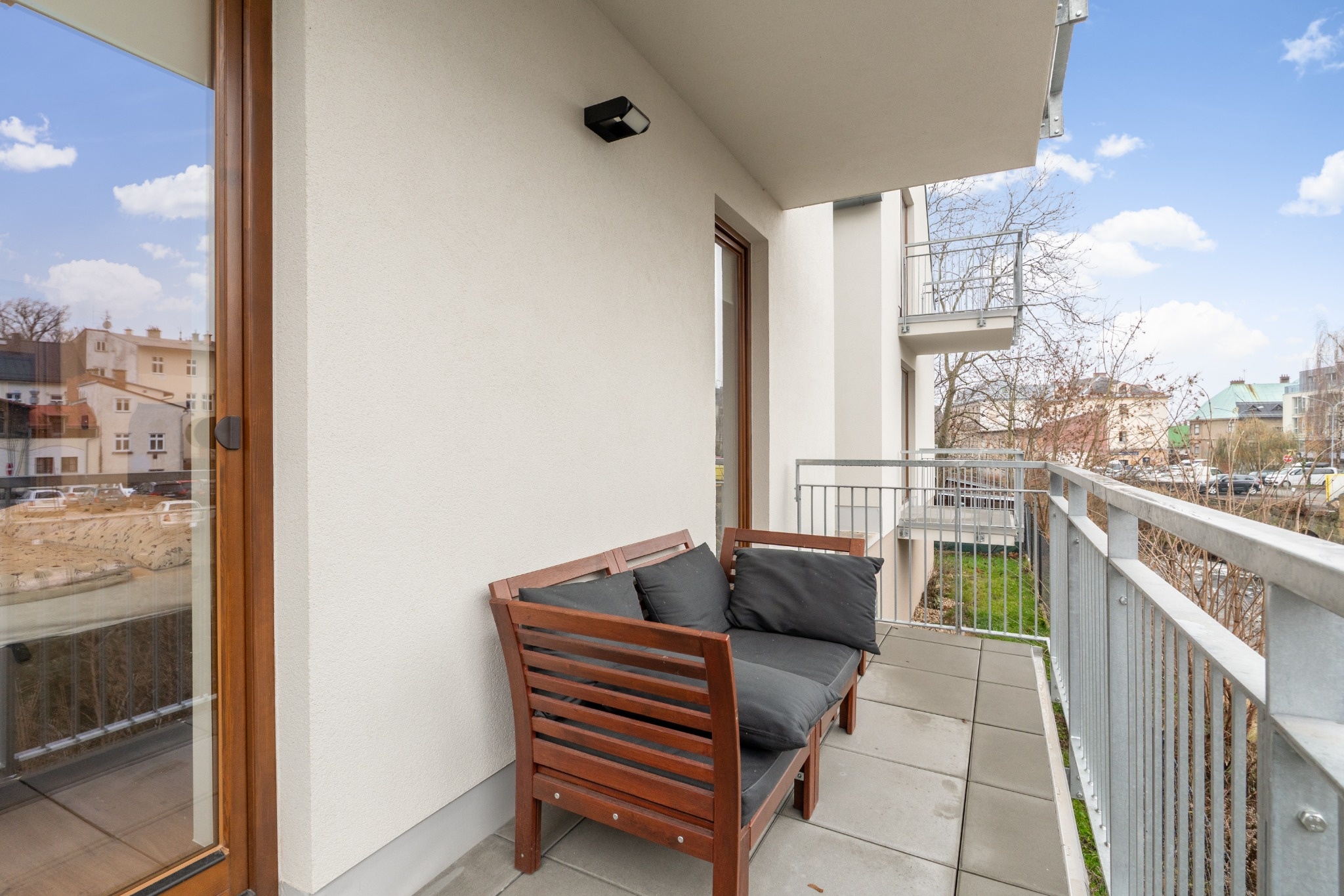 Obě ložnice mají přímý vstup na západně orientovaný balkón, který nabízí dostatek světla a příjemnou atmosféru zejména v odpoledních a večerních hodinách.