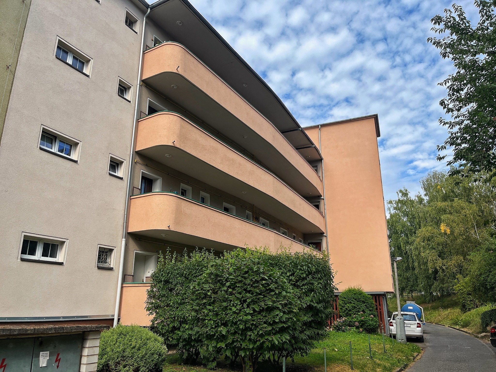 Byt se nachází ve 2. nadzemním podlaží (1. patro) domu s balkonem (na fotografii nejnižší balkon) a je čerstvě po vkusné rekonstrukci.